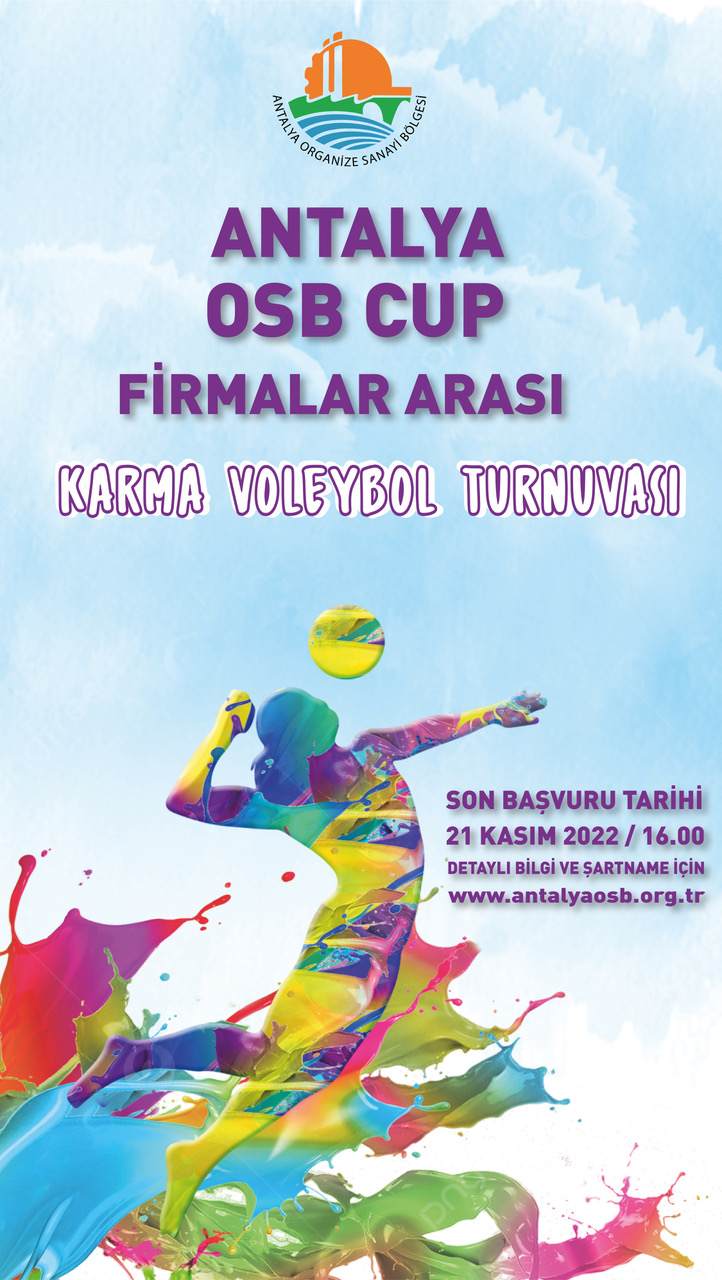 Antalya Organize Sanayi Bölge Müdürlüğü tarafından, Bölgemiz Firma çalışanları arasında birlik, beraberlik ve kurumlar arası kaynaşmayı sağlamak, çalışma motivasyonunu artırmak amacıyla Antalya OSB CUP Firmalar Arası Kadın-Erkek Karma Voleybol Turnuvası düzenlenecektir. Müsabakalar; Antalya OSB Teknik Koleji Kapalı Spor Salonunda gerçekleştirilecektir. (2. Kısım 22. Cad. No: 14 Döşemealtı/ANTALYA)