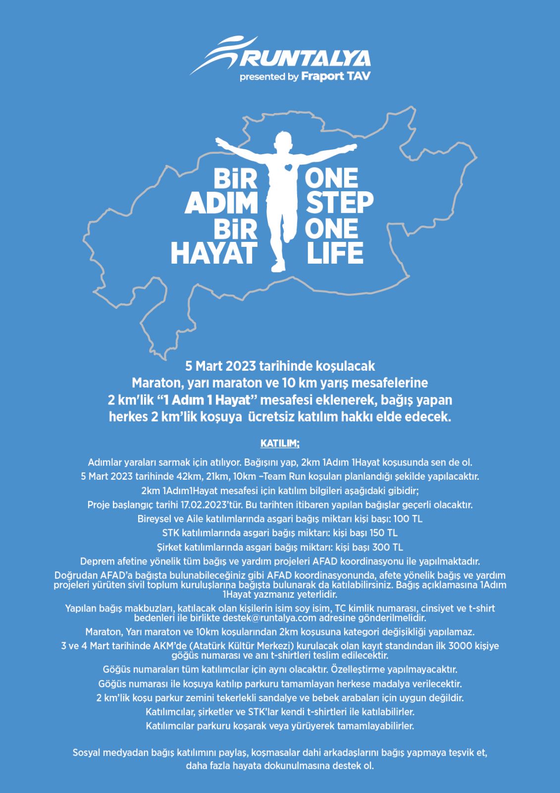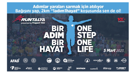 Runtalya’da adımlar yaraları sarmak için atılacak. 5 Mart 2023 tarihinde koşulacak olan ve bu yıl 18’inci kez düzenlenecek olan Runtalya Maratonu, yarı maraton ve 10 km yarış mesafelerine 2 km’lik ‘‘1 Adım 1 Hayat’’ mesafesi eklenerek, bağış yapan herkes 2 km’lik koşuya ücretsiz katılım hakkı elde edecektir.