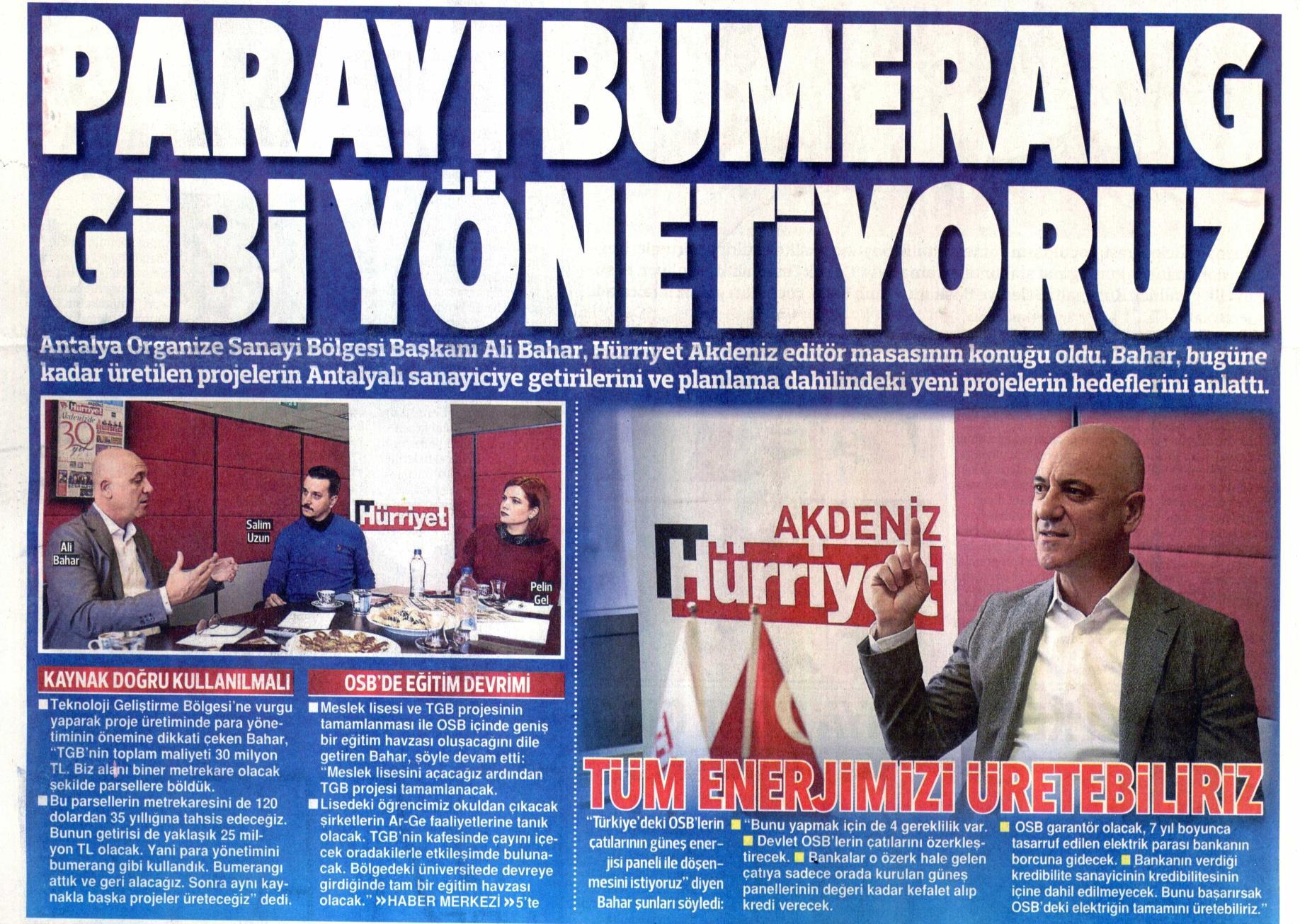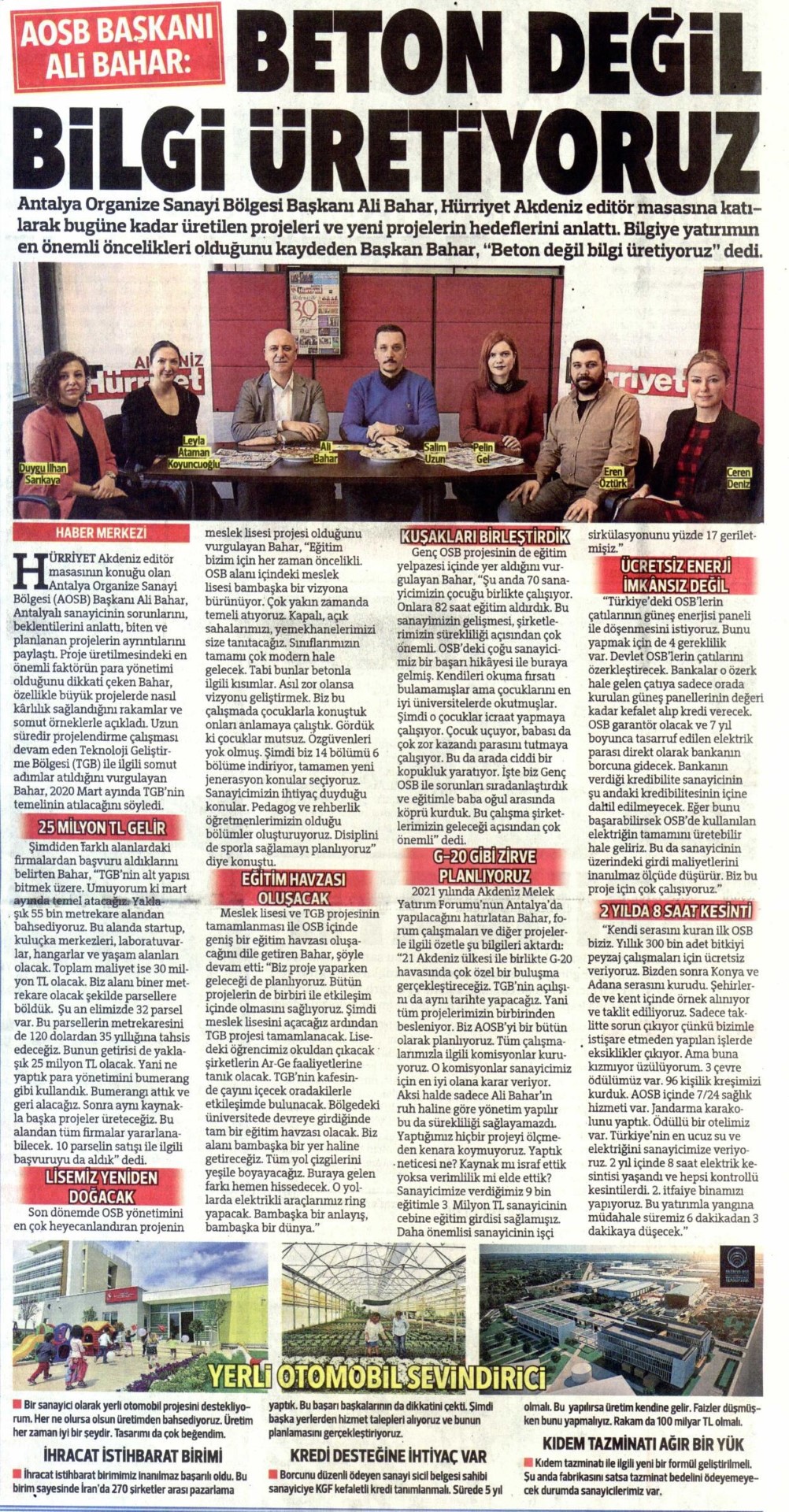 Antalya Organize Sanayi Bölgesi Başkanı Ali Bahar, Hürriyet Akdeniz editör masasına katılarak bugüne kadar üretilen projeleri ve yeni projelerin hedeflerini anlattı. Bilgiye yatırımın en önemli öncelikleri olduğunu kaydeden Başkan Bahar, "Beton değil bilgi üretiyoruz" dedi.